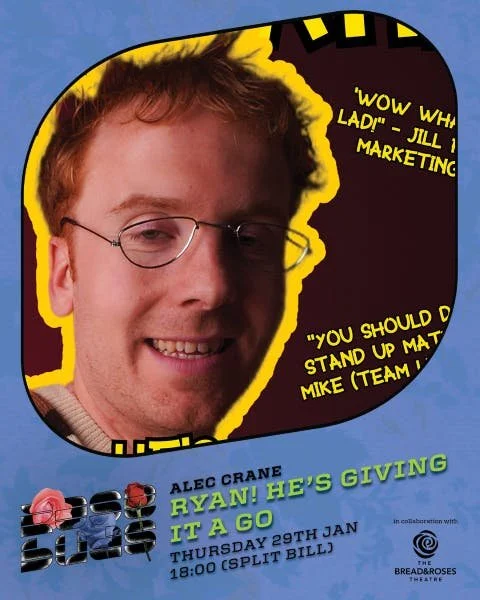 Ryan, he's always wanted to give comedy a go! So here he is, GIVING IT A GO! Expect excellent banter, just like you're in the office! It's proper mad ahaha! - Alec Crane is Welsh character Comedian bringing all sorts of nonsense to the stage since 2023. Including sell-out runs of his previous 'Hour of Controlling the Dead' at Brighton Fringe, Camden Fringe and The Rik Mayall Comedy Festival Mentions of death, violence, swearing and flashing lights.